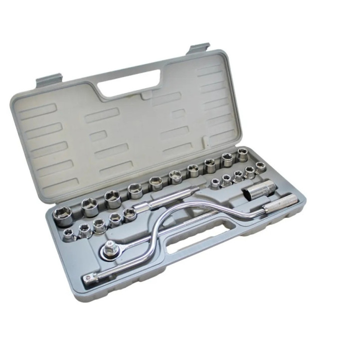 ENCASTRE 1/2". LLAVE CRIQUE REVERSIBLE. BARRA DE EXTENSIÓN: 5". TUBO SACA BUJÍAS: 21 MM. 15 TUBOS EN MM: 8/9/10/11/12/13/14/15/16/17/18/19/20/21/22. 5 TUBOS EN PULGADAS: 3/8, 7/16, 1/2, 9/16, 5/8. MEDIDA DE CAJA ORGANIZADORA: 40 x 19 x 4 cm.